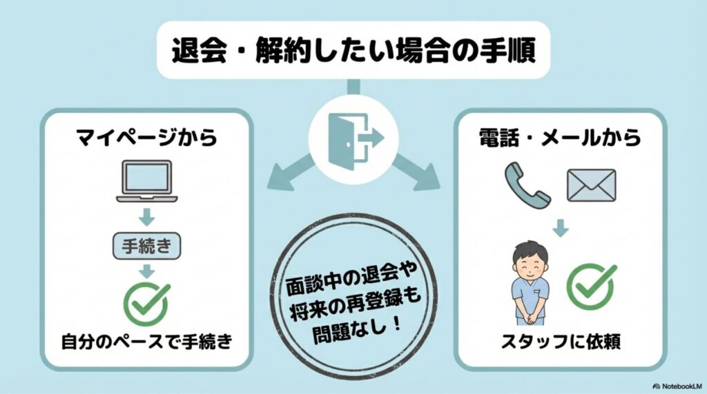 マイページからの操作に不安がある場合は、電話またはメールで退会を申し出ることもできます。担当スタッフから確認の連絡が入り、対応してもらえます。