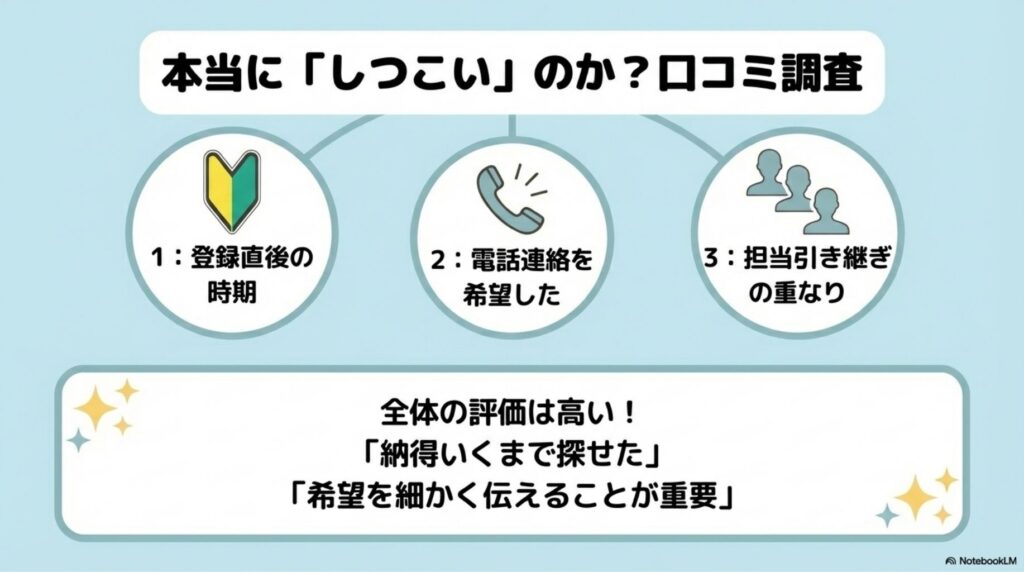 コーディネーターが電話でフォローするため、折り返しの電話が重なったり、タイミングが悪いと複数回かかってきたりするかもしれません。
