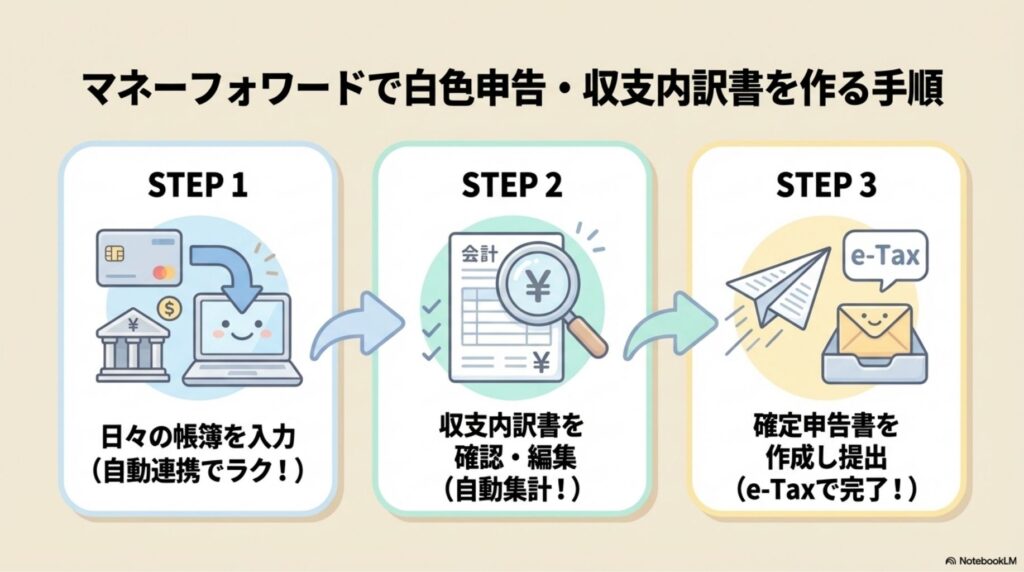 マネーフォワードクラウドで白色申告を行う流れは、大きく3つのステップに分かれます。