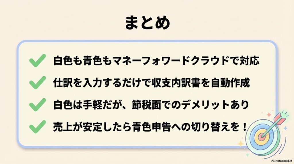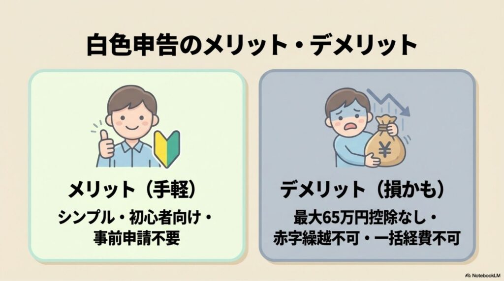 • 白色申告は手軽だがデメリットも大きい:65万円控除・赤字繰越が使えない