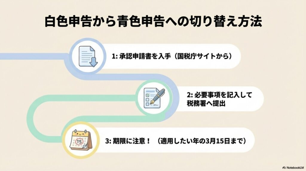 青色申告に切り替えるには、「所得税の青色申告承認申請書」を税務署に提出する必要があります。手順は以下のとおりです。