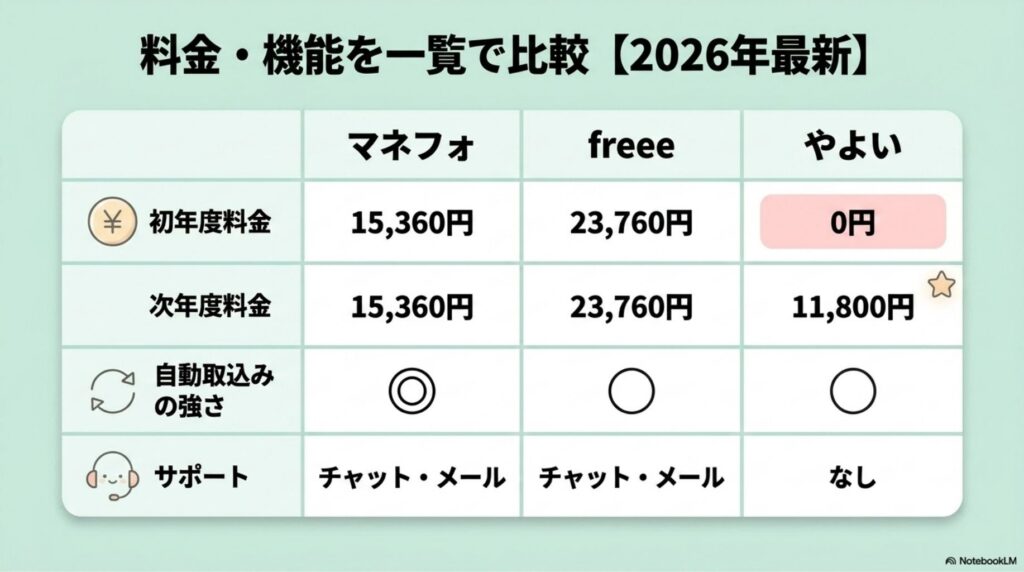 3ソフトの料金と主要機能を一覧にしました。年間コストは青色申告(65万円控除)ができるプランで比較しています。