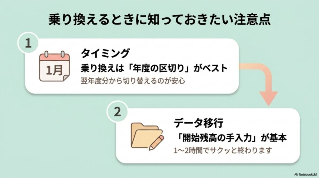 乗り換えるなら1月1日・事業年度の開始タイミングがおすすめです。年度途中で切り替えると、同じ年の帳簿が2ソフトに分かれてしまい、確定申告時に整合性を取るのが大変になります。