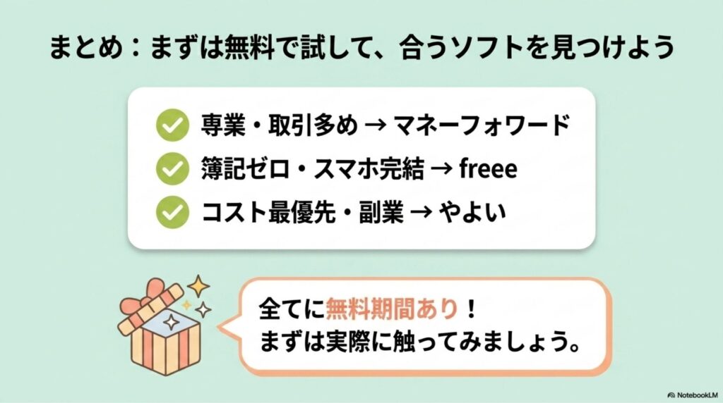 まとめ:まずは無料で試して、合うソフトを見つけよう
