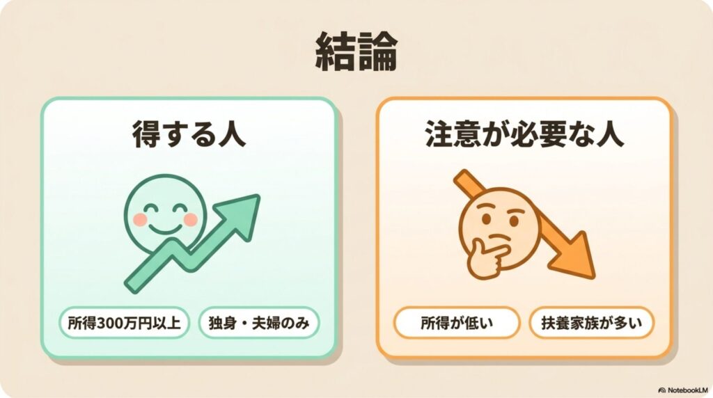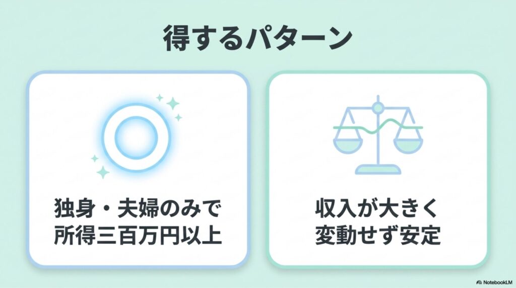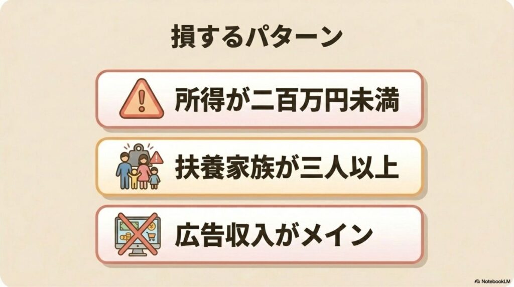 • 損しやすい人:所得200万円未満・扶養家族が多い・広告収入メイン