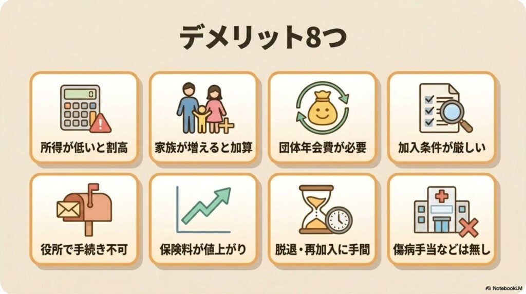 デメリットは全部で8つ。とくに「所得が低い」「扶養家族が多い」人は、自治体の国保のままのほうが安くつく可能性が高いです。