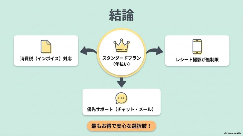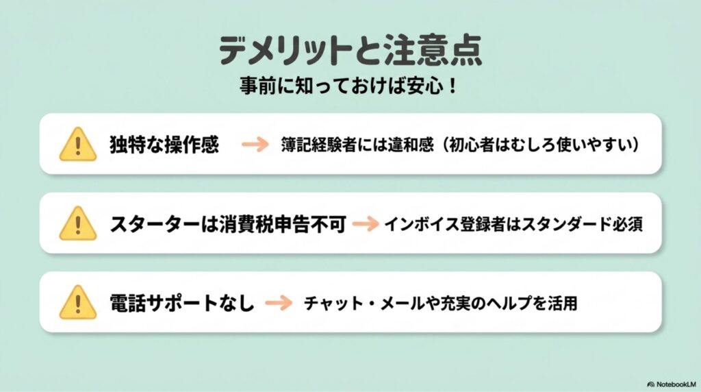 - デメリットは「電話サポートなし」と「スターターの消費税制限」:どちらも事前に把握しておけば問題ない