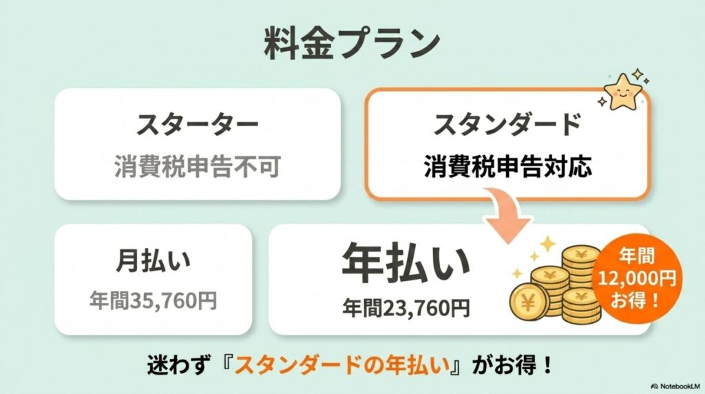 - プランはスタンダード年払い(月換算1,980円)がおすすめ:インボイス登録済みならスタンダード一択、年払いで年12,000円お得