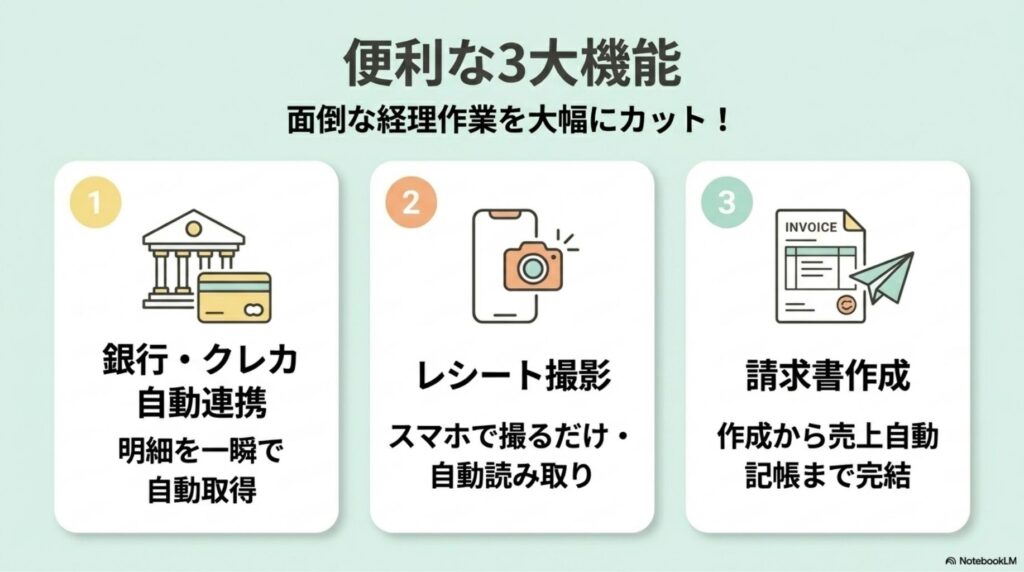 銀行連携・レシート撮影・請求書作成をフルに使うと、毎月の経理が驚くほど短縮されますよ!