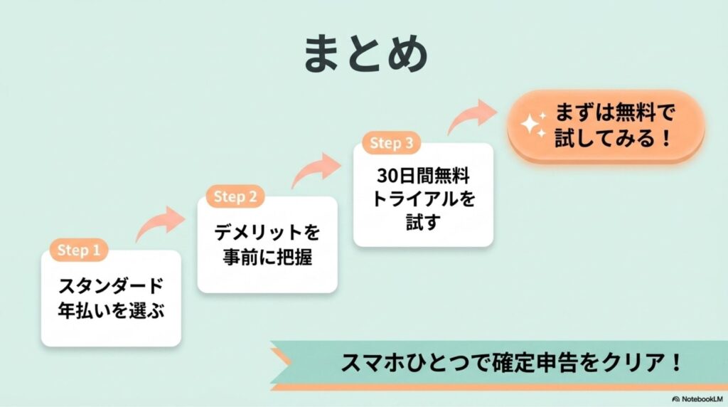 - まず30日間の無料トライアルで試す:確定申告シーズン前に始めると一番活用できる