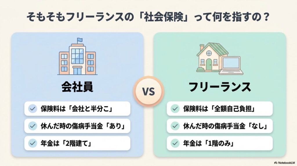 「社会保険」という言葉は広すぎて、正直わかりにくいですよね。まずはフリーランスに関係する制度だけを取り出して整理します。