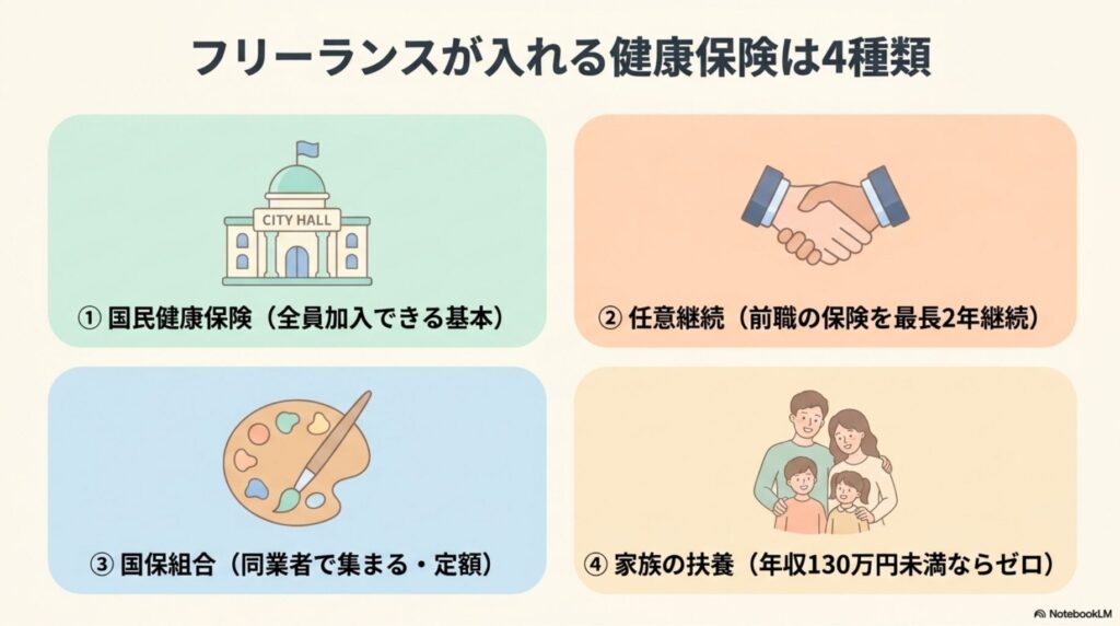 フリーランスの社会保険は、健康保険4択+年金上乗せ3択の組み合わせで決まります。結論をシンプルにまとめると次の3点です。