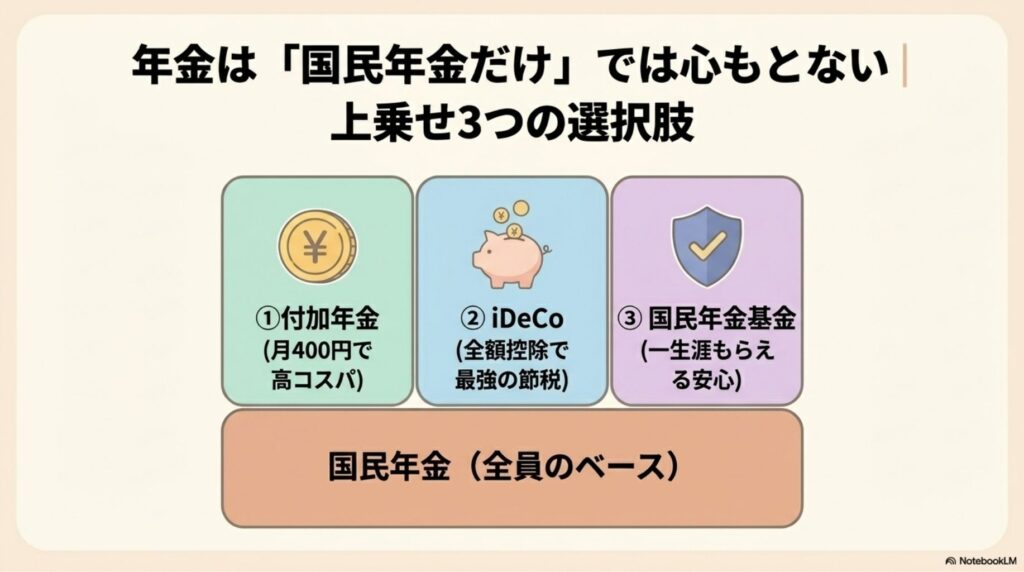 年金は「国民年金だけ」では心もとない|上乗せ3つの選択肢