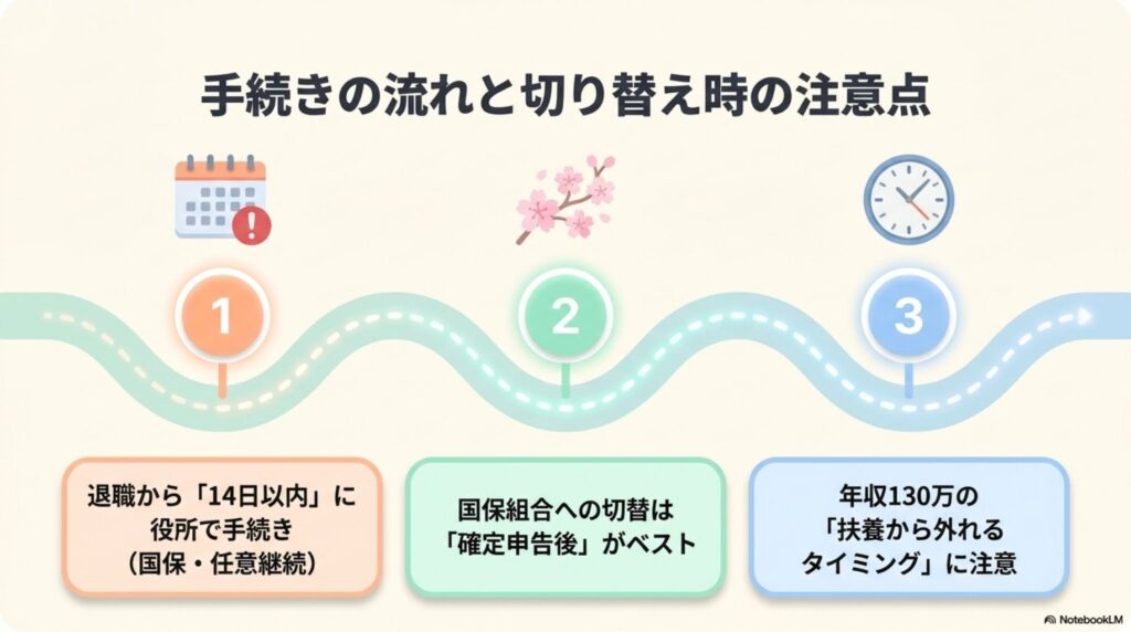 • 健康保険は「1年目は国保、所得300万超で組合」:家族が多いなら任意継続も選択肢