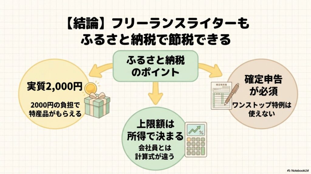 結論から言うと、フリーランスライターもふるさと納税の控除を使えます。会社員のような「ワンストップ特例」は使えませんが、確定申告で寄附金控除を申告すれば、所得税と住民税が減ります。