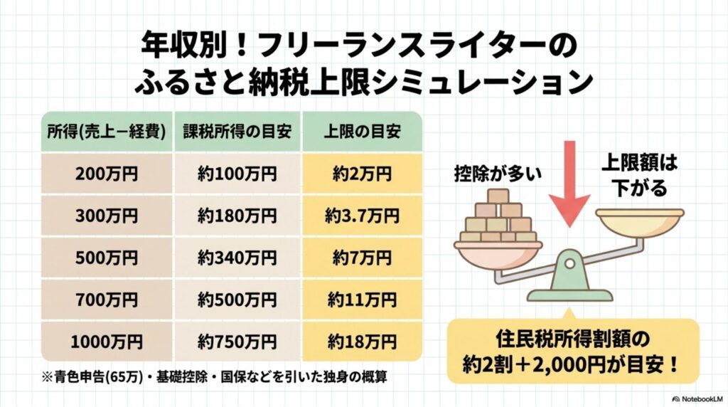 ※あくまで概算です。青色申告特別控除65万円・基礎控除48万円・国保&国民年金などを差し引いた前提。実際の金額は個別の控除状況で変わるので、必ず各ふるさと納税サイトの詳細シミュレーターで再計算してください。