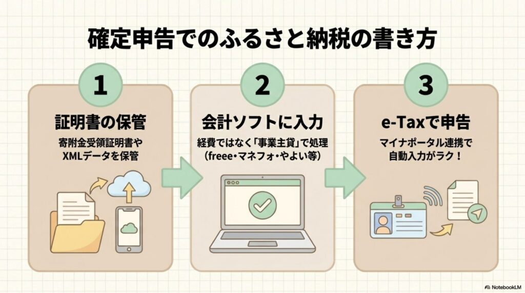 たとえばfreee会計なら、確定申告書類の作成→控除→寄附金控除に進み、寄附先・金額を入力します。マネーフォワードクラウドややよいの青色申告オンラインも同様に控除欄から入力可能。詳しくは3大会計ソフトの比較記事もあわせて確認してください。