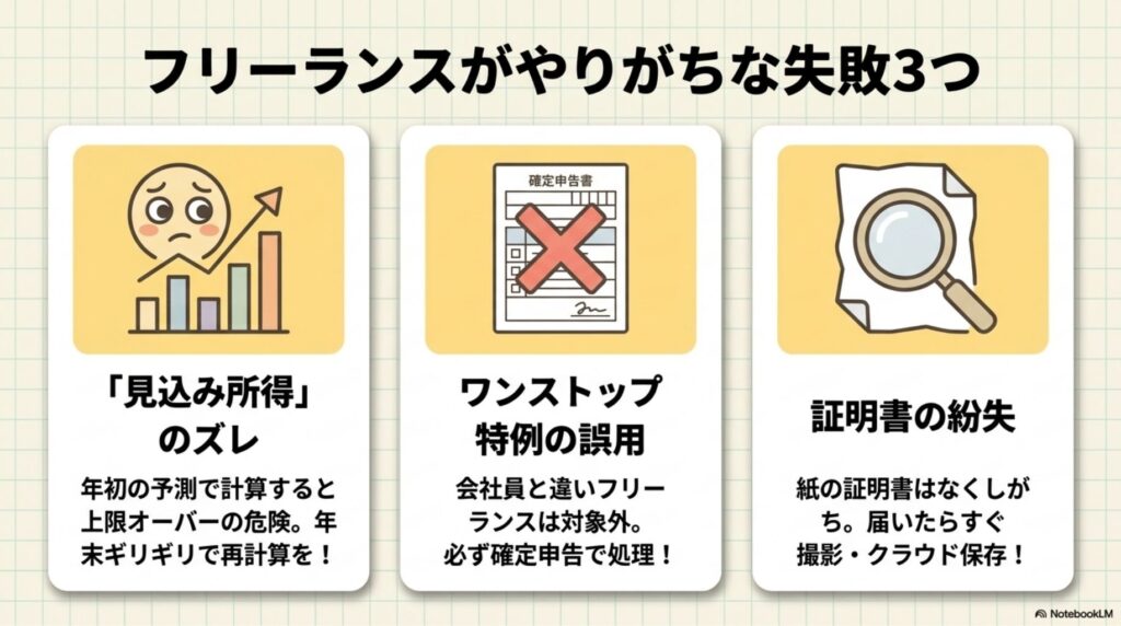 1つ目の失敗は「年初に見込んだ所得」で上限を計算してしまうパターン。フリーランスは年末まで売上が確定しないので、見込みより収入が下がると上限を超えてしまいます。