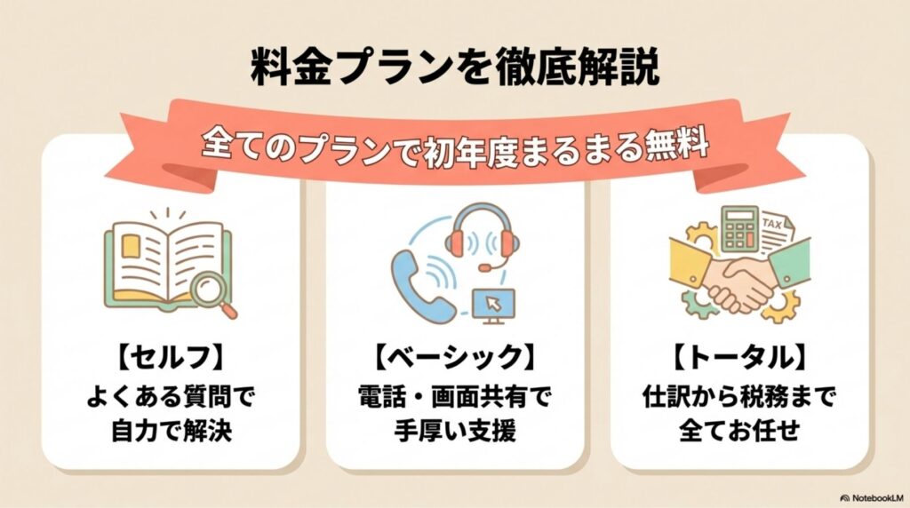 多くのフリーランスの方には、まずベーシックプランで1年無料体験して、操作に慣れてきたら2年目以降はセルフプランでコストを抑えると良いでしょう。