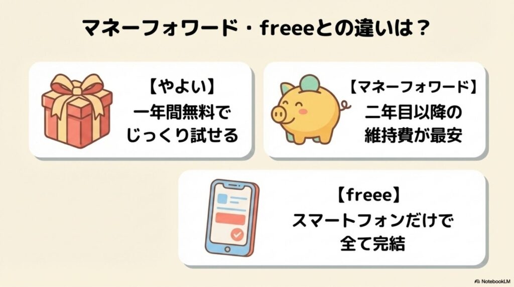 会計ソフトを選ぶとき、「やよいにするかマネーフォワードにするか」で迷う方はとても多いです。簡単に違いを整理しておきます。