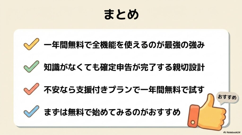 でも、「初年度無料だけど2年目からどうなるの?」「サポートなしのプランで本当に確定申告できる?」という疑問、ありませんか?